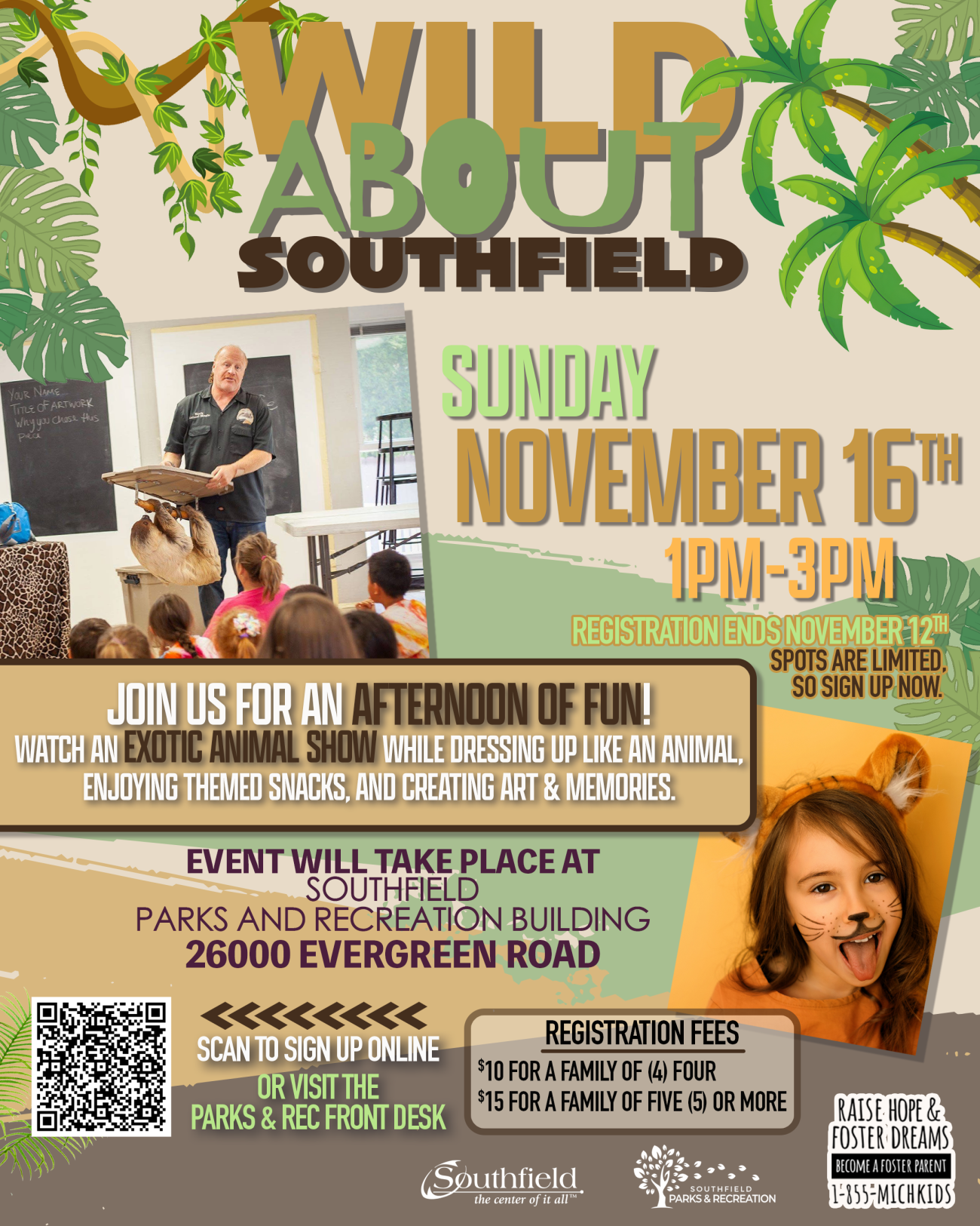 Join us for an unforgettable afternoon of fun and adventure at Wild About Southfield — a live exotic animal show happening Sunday, November 16 from 1–3 PM at the Southfield Parks & Recreation Building (26000 Evergreen Rd)!