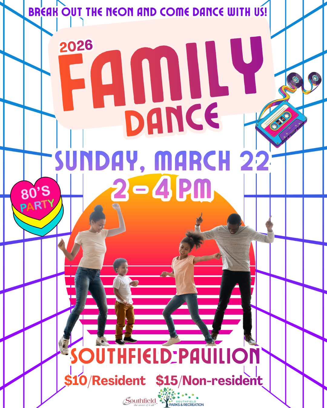 Break out the neon and come dance with us! Join Southfield Parks & Recreation for our first-ever Family Dance, a retro 80s–themed celebration for the whole crew. Enjoy an afternoon of music, movement, and memory-making as families come together for a fun-filled party.