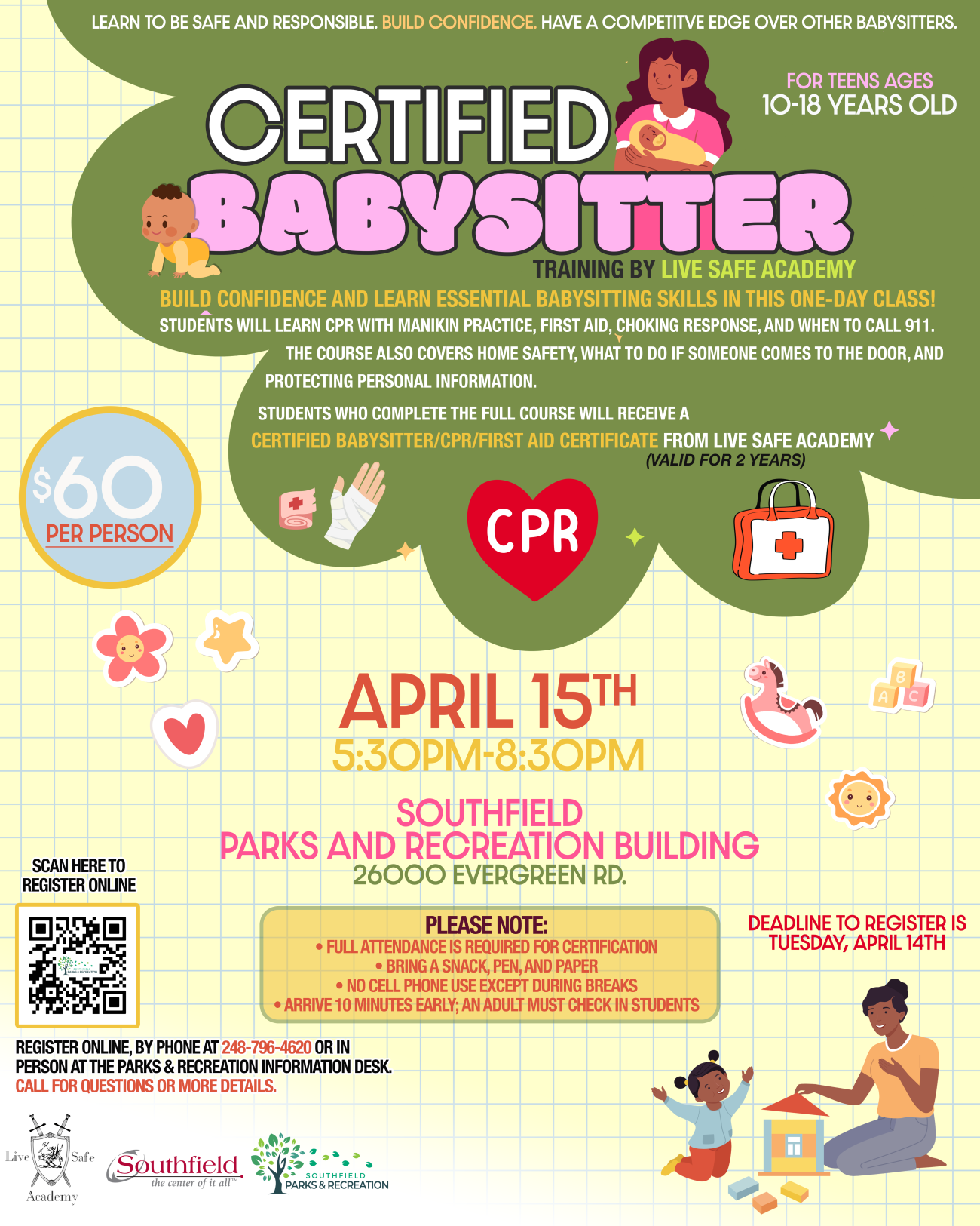Build confidence and learn essential babysitting skills in this one-day certification class offered through Southfield Parks & Recreation in partnership with Live Safe Academy.