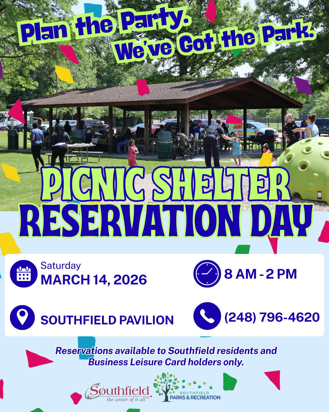 Picnic shelter reservations are available to Southfield residents and Business Leisure Card holders only.