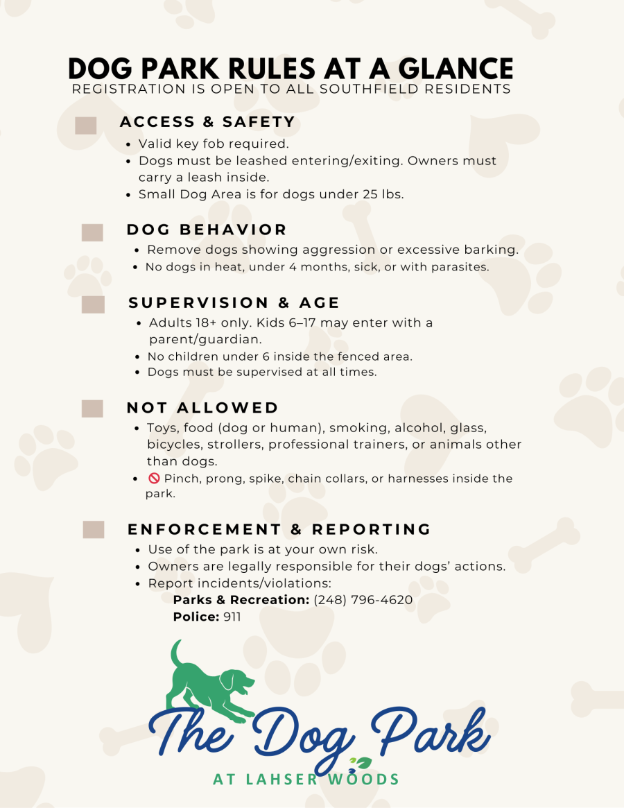 Your membership includes a key fob and dog tag. Replacement fees: $10 (fob) / $5 (tag).