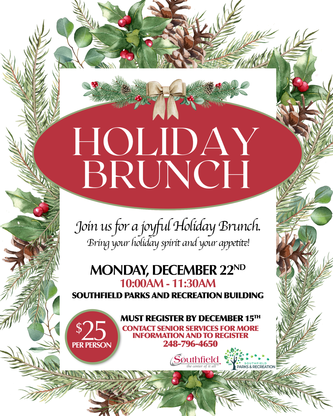 Join us for the Senior Services Holiday Luncheon on Friday, December 12 from 11:30 amâ1 pm at the Southfield Parks & Recreation Building. Enjoy a hot meal from TJâs Catering and a few rounds of holiday bingo after lunch!