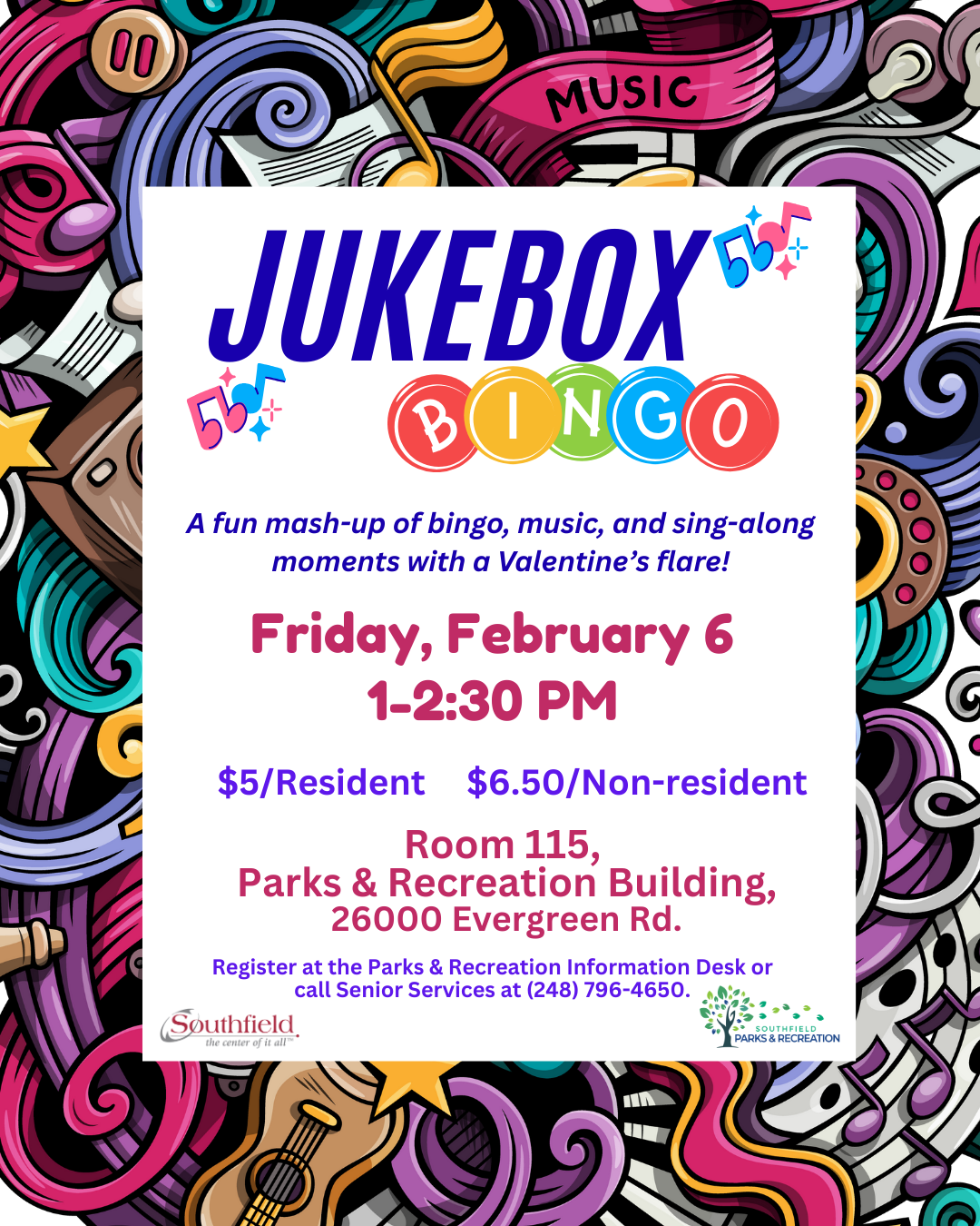 Join Southfield Senior Services for a fun and festive Valentine-themed afternoon where music replaces numbers in this lively twist on traditional bingo. Enjoy familiar tunes, laughter, and great company in a relaxed, social setting.