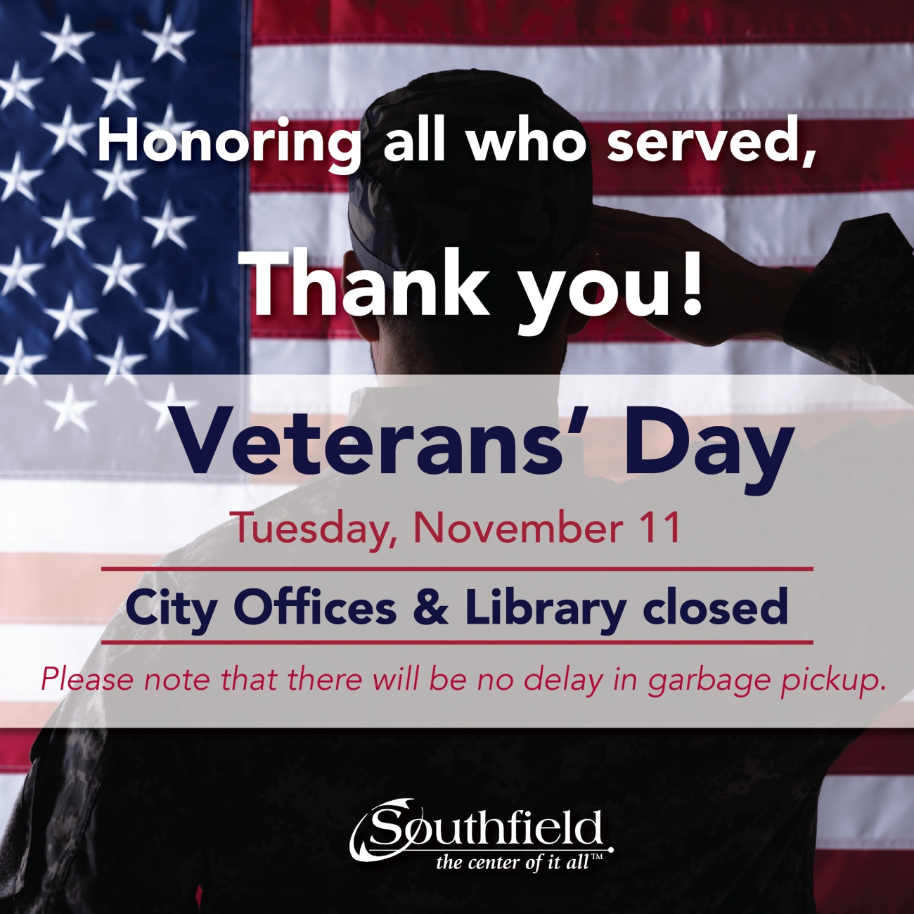 The City of Southfield Offices and Library will be closed on Tuesday, November 11 in observation of Veterans' Day. City offices will reopen for business at 8 a.m. on Wednesday, November 12.