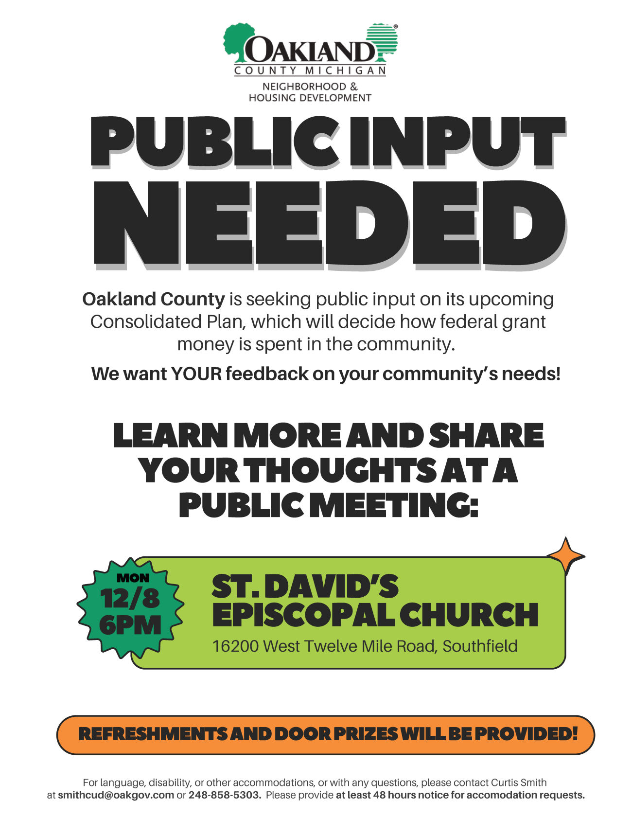 Oakland County is seeking public input on its upcoming Consolidated Plan, which will decide how federal grant money is spent in the community.