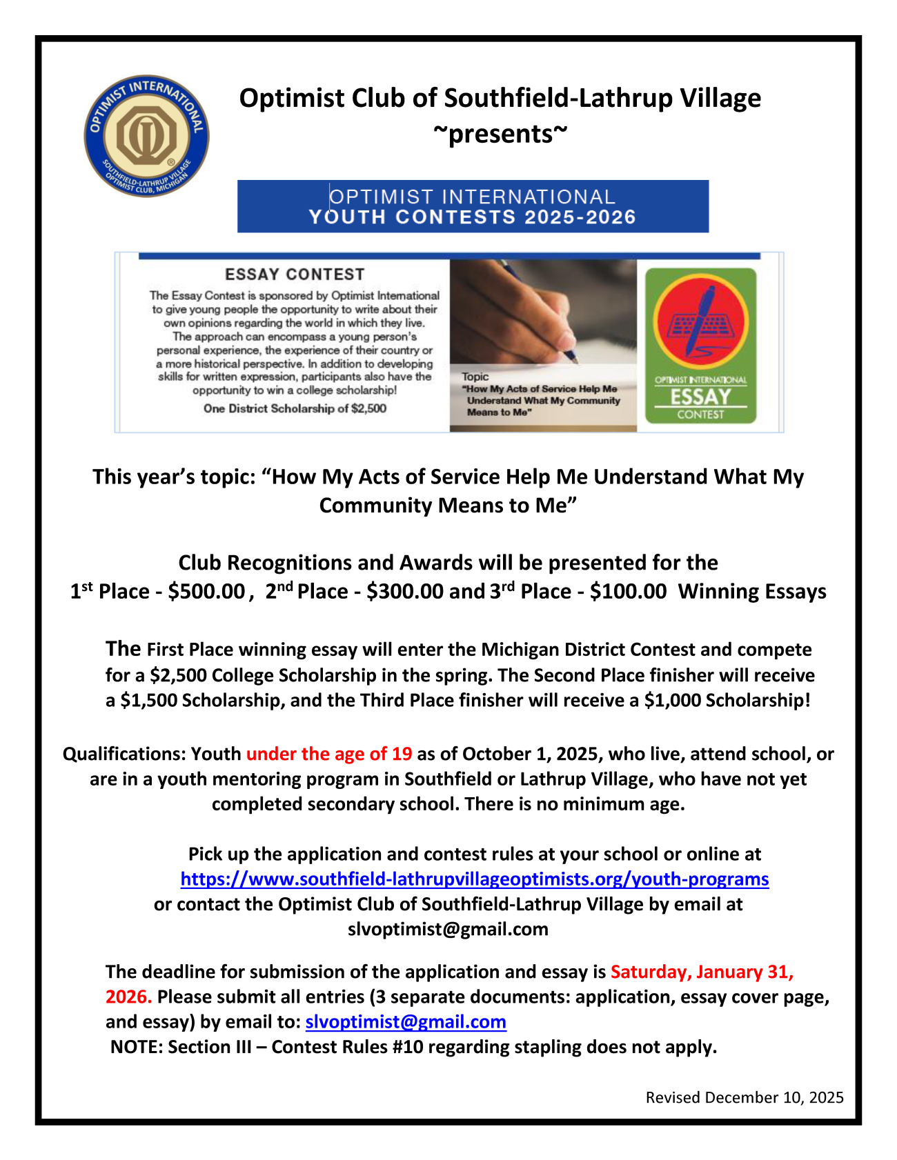 Application and contest rules can be found online at https://www.southfield-lathrupvillageoptimists.org/youth-programs or contact the Optimist Club of Southfield-Lathrup Village by email at slvoptimist@gmail.com