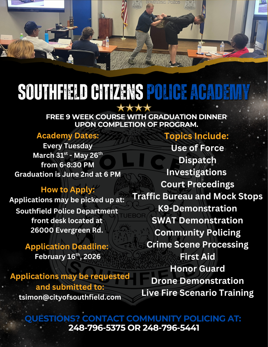 The Southfield Police Department is now accepting applications for its upcoming Citizens Police Academy, a free nine-week program designed to give residents an inside look at local law enforcement operations.