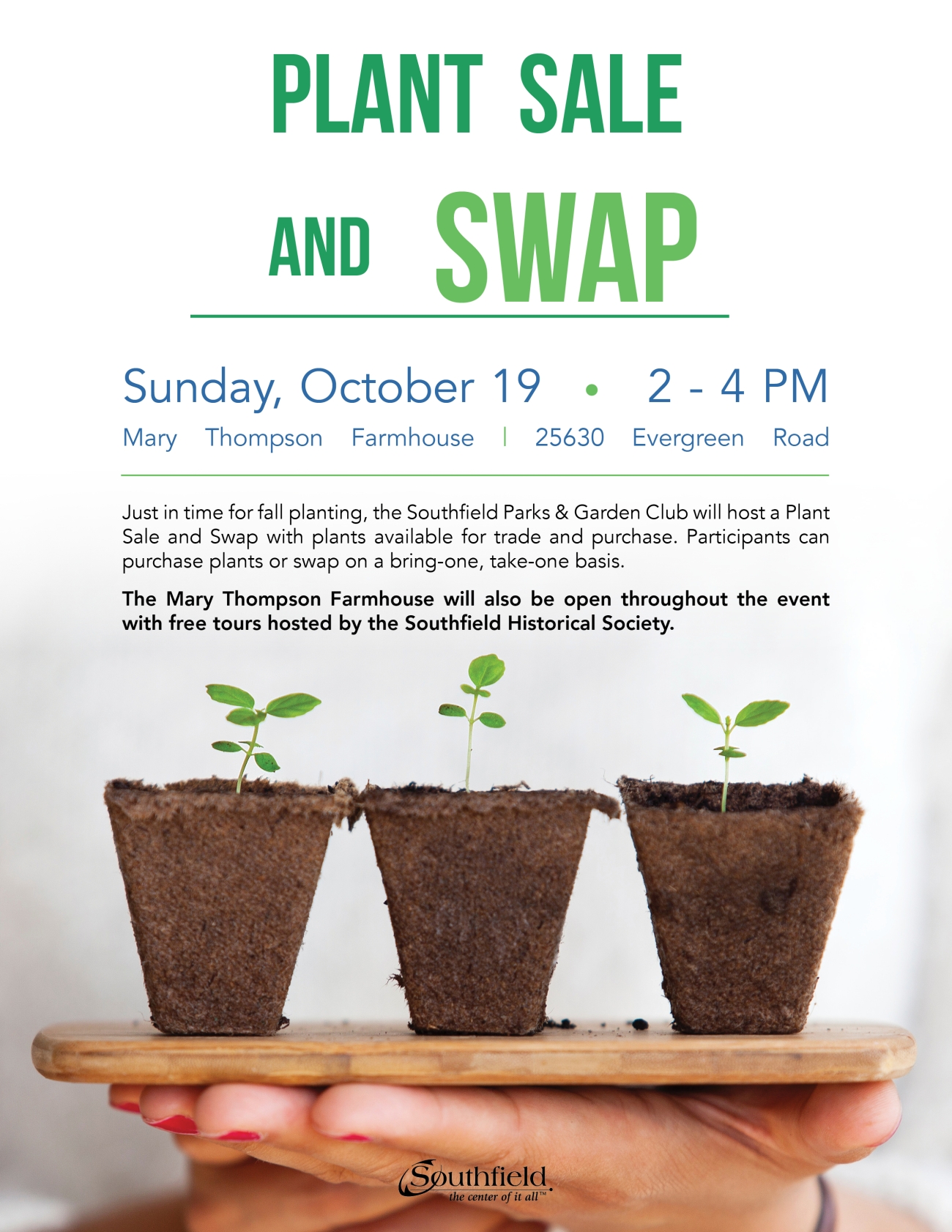 The Southfield Parks and Garden Club (SP&GC) will host its annual Plant Sale and Swap on Sunday, October 19 from 2-4 p.m. at the Mary Thompson Farmhouse, 25630 Evergreen Road.
