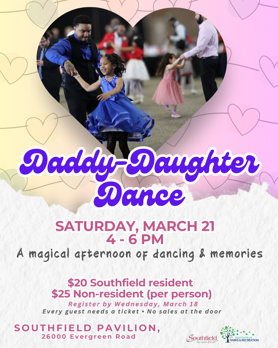 Calling all little princesses ages 2–12 and their favorite guy! Join Southfield Parks & Recreation for a magical afternoon of dancing, fun, and quality time together at our annual Daddy Daughter Dance.