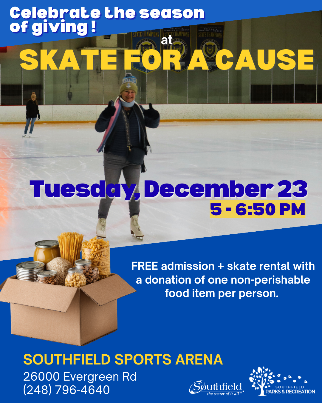 Southfield Parks & Recreation invites residents of all ages to lace up their skates and give back this holiday season at Skate for a Cause, taking place Tuesday, December 23 from 5–6:50 p.m. at the Southfield Sports Arena, 26000 Evergreen Road.