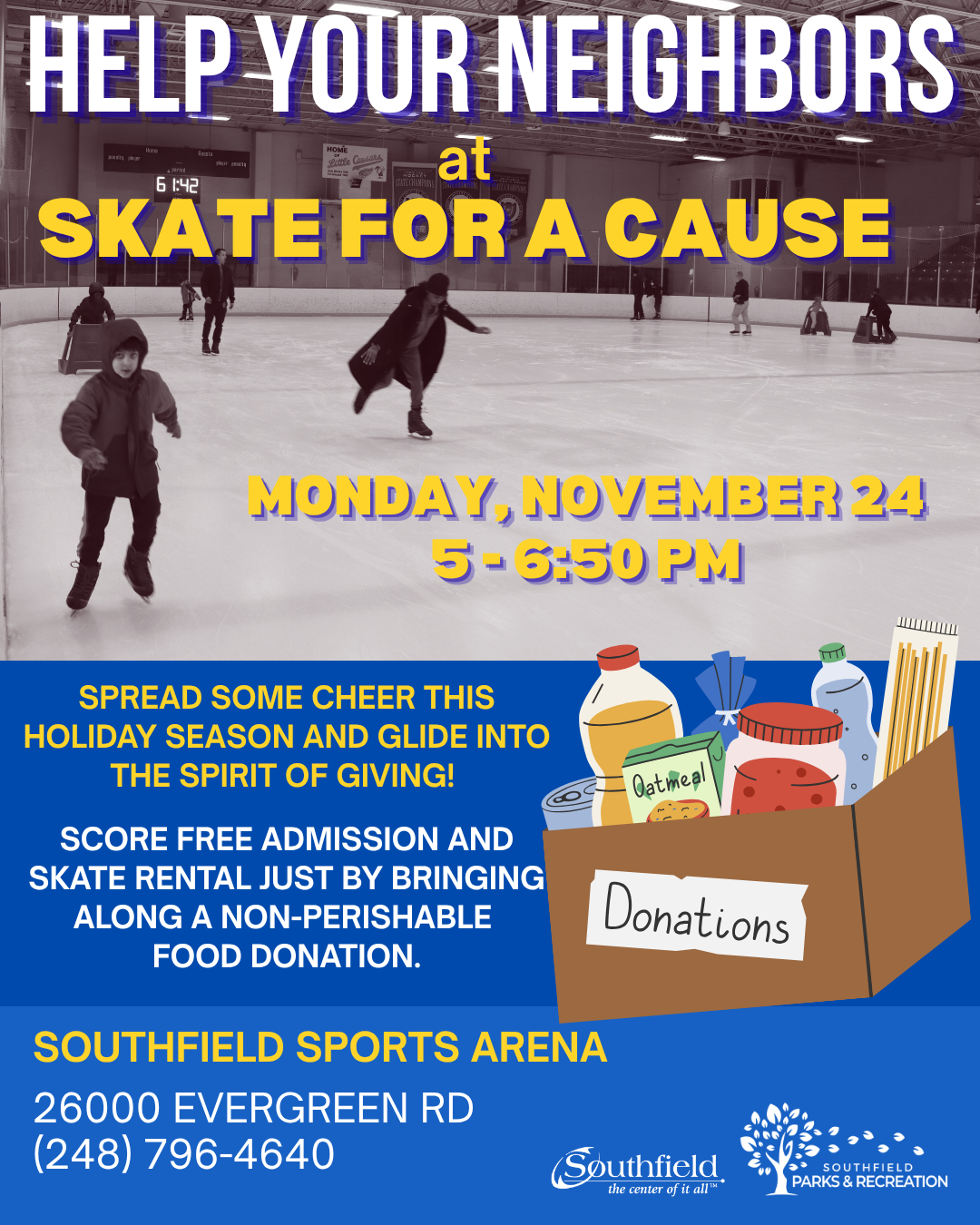 The City of Southfield Parks & Recreation Department invites residents of all ages to lace up their skates and give back this holiday season at Skate for a Cause, taking place Monday, November 24 from 5–6:50 p.m. at the Southfield Sports Arena, 26000 Evergreen Road.